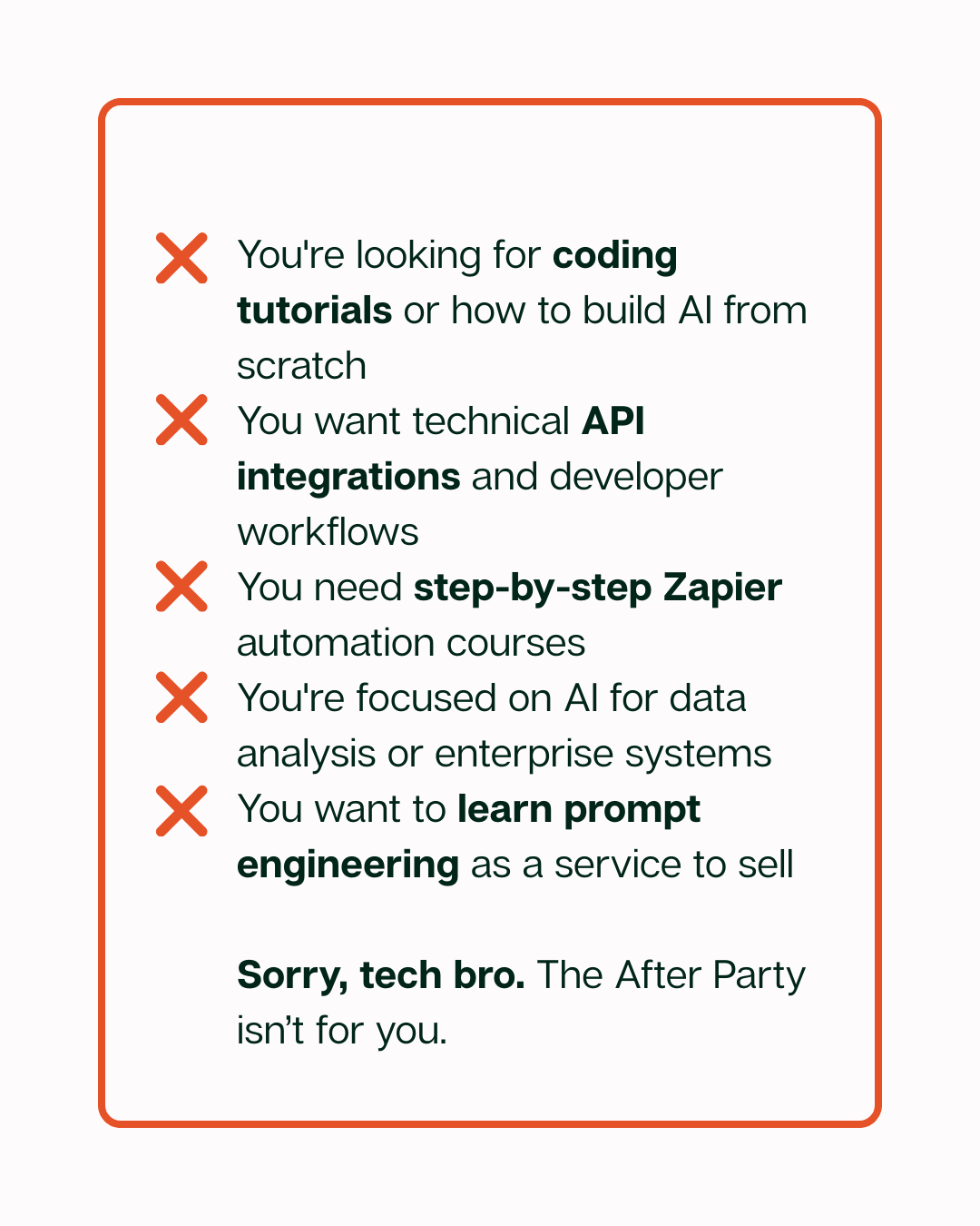 The After Party is the monthly membership for creatives who want to use AI to as a force multiplier to stay ahead and be creatively dangerous.