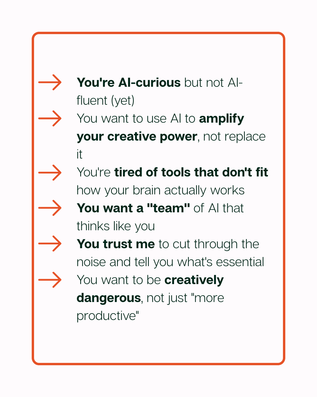 You don't want AI for efficiency porn. You want to feel like a creative powerhouse with a whole damn team backing your moves. You want differentiation, not delegation. You want to pour your energy into work that lights you up and let AI handle the rest.