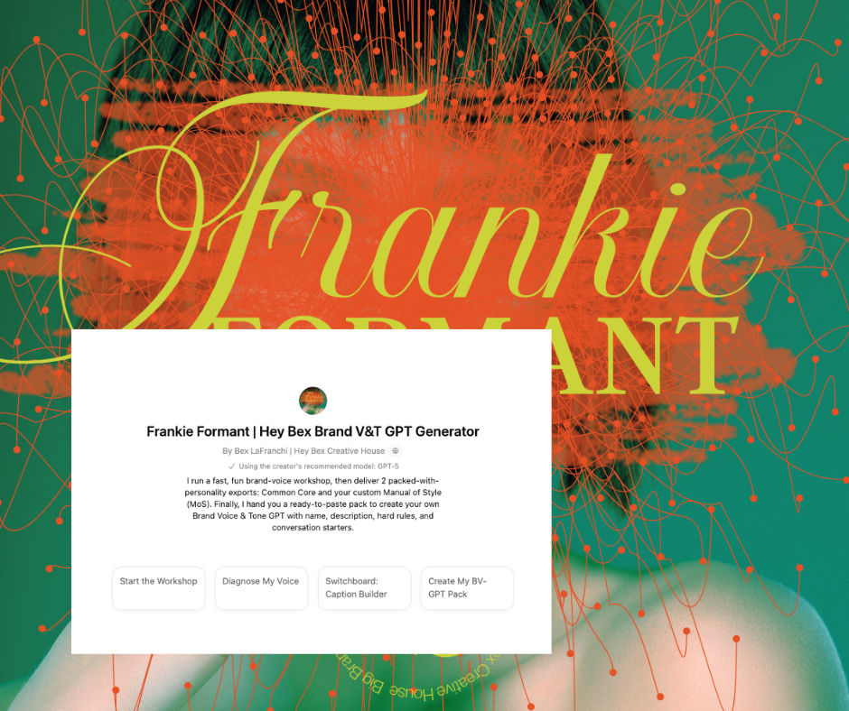 Your voice isn’t just words—it’s your entire brand’s frequency. And if finding that voice feels like screaming into the void, meet Frankie Formant. It’s my Brand V&T GPT Generator that builds you a cravey, cult-worthy tone for just $77.