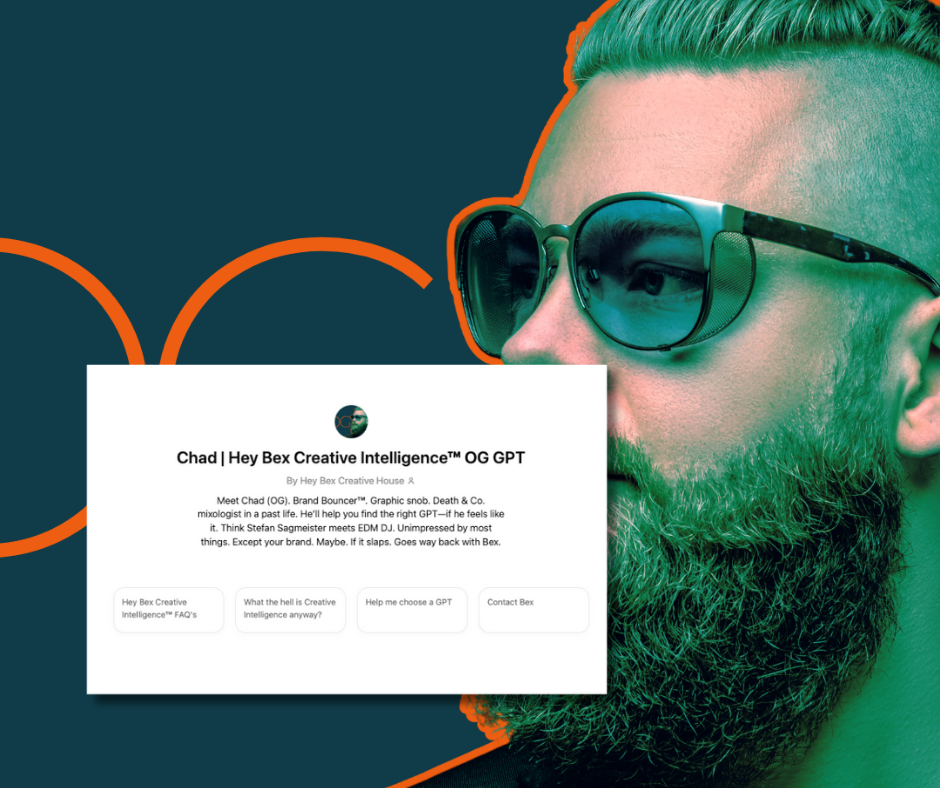 Meet Chad (OG). Brand Bouncer™. Graphic snob. Death & Co. mixologist in a past life. He’ll help you find the right GPT—if he feels like it. Think Stefan Sagmeister meets EDM DJ. Unimpressed by most things. Except your brand. Maybe. If it slaps. Goes way back with Bex.