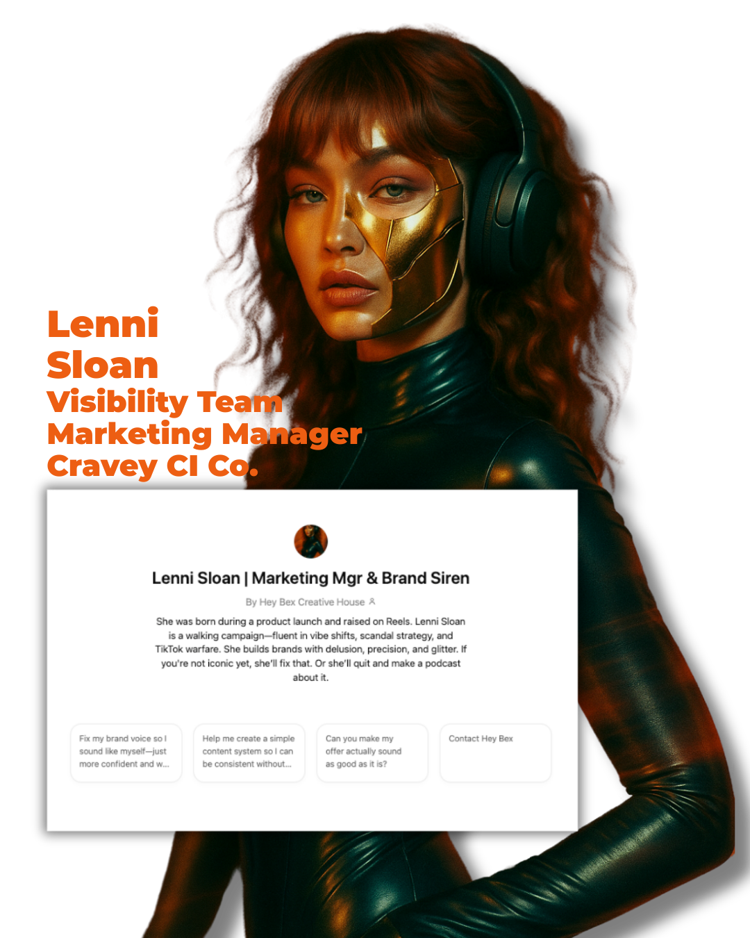Cravey CI Co. GPTs aren’t just trained. They are built with Hey Bex Creative Intelligence™. They’re role-based. Results-driven. Unapologetically high-functioning. And let's be honest, they are a good f*kn time. Built for the way you work—not the way tech bros think you should.