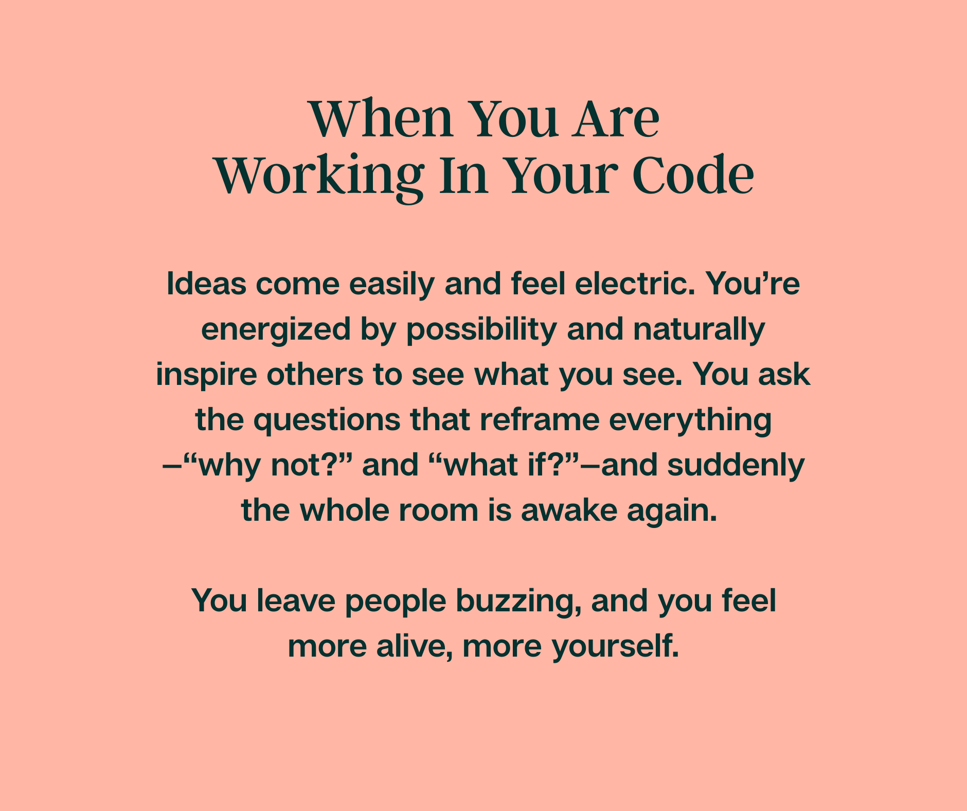 This is your genius zone: the ability to pull ideas out of thin air, set the tone for the room, and energize people into motion. Without Visionaries, there is no why. There is no starting spark. You set the vision that gives everyone else something to build on.